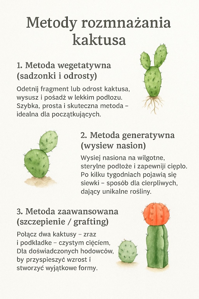 W tym artykule znajdziesz praktyczną instrukcję krok po kroku, która pomoże Ci dobrać najlepszą metodę rozmnażania, przygotować podłoże, zadbać o sterylność i uniknąć najczęstszych błędów hodowlanych. Dowiesz się też, jak pielęgnować młode kaktusy, by szybko się ukorzeniły i rosły bez ryzyka gnicia.